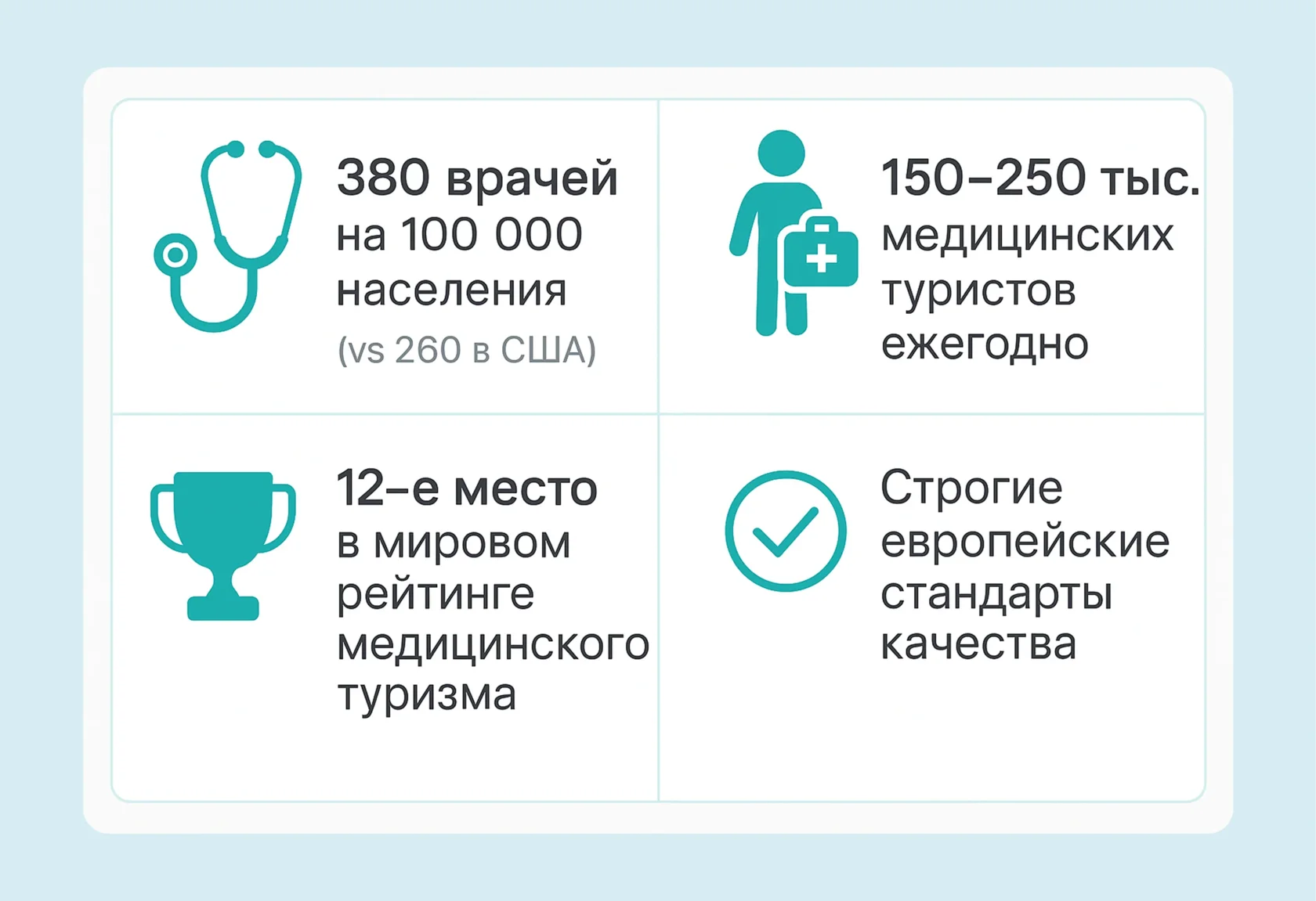 - Высокая плотность медицинских кадров В Германии работает 380 врачей на 100 000 человек населения — больше, чем в США или Канаде. Это означает более персонализированный подход к каждому пациенту.